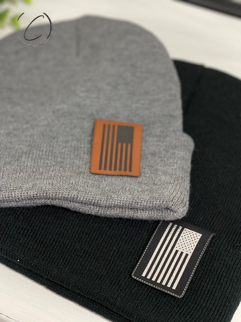 The design is engraved into the patch and not vinyl or any sort of sticker. Select the color of beanie and patch! The beanie is made from 100% acrylic and the patch is vegan leather. The patch color chestnut is darker brown engraves black and the color black engraves silver.