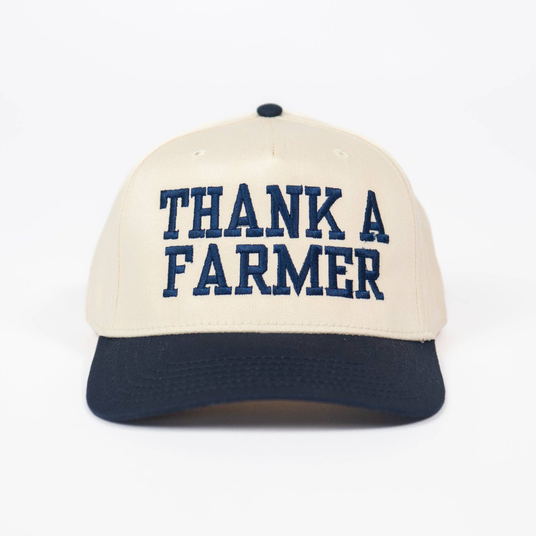 Express your gratitude with 'Thank A Farmer' embroidered trucker hat! This stylish hat features a navy bill, cream top, and a playful message in navy embroidery. Show your appreciation for farmers while keeping the sun out of your eyes.